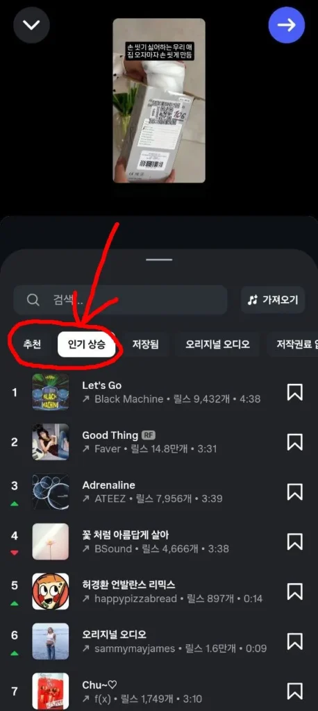 화살표 표시가 있는 음원을 선택하시면 됩니다.